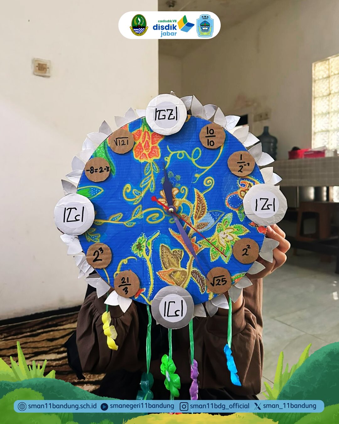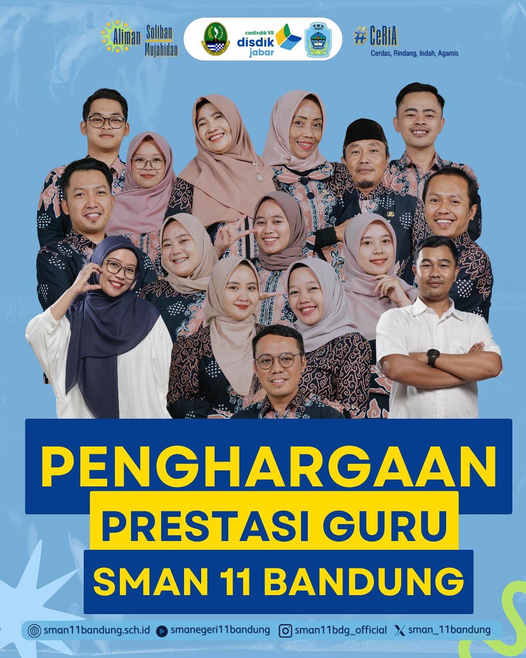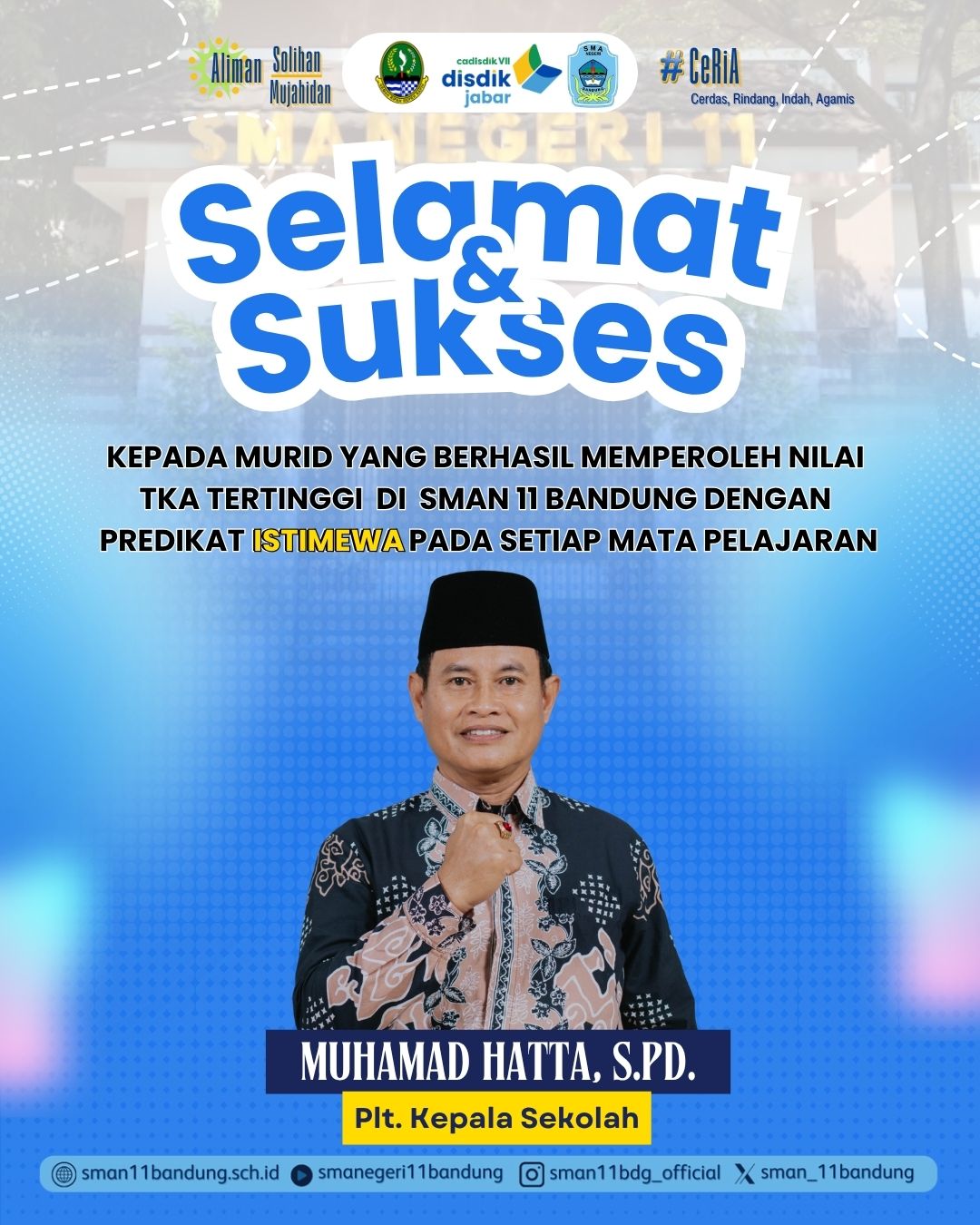 Sampurasun…. Alhamdulillah puji syukur saya panjatkan kehadiran Allah SWT yang selalu kemudahan serta keberkahan yang melimpah pada kita semua dan juga rasa syukur yang tak terhingga dalam upaya mengemban amanah memajukan Pendidikan di Indonesia terutama di SMA Negeri 11 Bandung yang CERIA (Cerdas, Rindang, Indah, dan Agamis), Aliman (berwawasan pengetahuan, teknologi, serta keterampilan), Sholihan (berbudi pekerti luhur, patuh melaksanakan perintah agama, terciptanya budaya disiplin, tertib dan sehat), Mujahidan (mampu berkompetisi, semangat menuntut ilmu, dan melaksanakan setiap aspek yang menjadi tanggung jawab dan kewajibannya). Serta pembentukan karakter murid melalui visi misi sekolah kami yaitu :